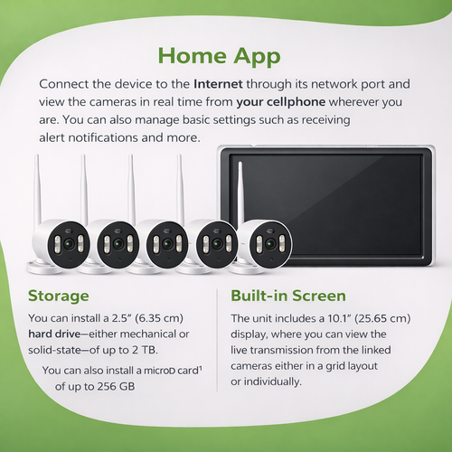 This wireless CCTV security system includes an 8-channel NVR, four Wi-Fi cameras, and a built-in 10.1" screen for convenient monitoring. It allows you to view live footage from your home, office, or business remotely through your smartphone, with support for motion detection and face recognition. Designed for reliable outdoor use, the cameras feature IP65 protection, color night vision, two-way audio, and flexible storage options up to 2 TB.